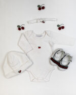 Lacinho de malha tricotada 100% algodão, mesma das roupinhas, com bordado cerejinha em pompom.
