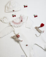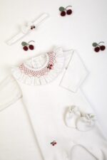 Com gola bordada em ponto smocking no tema da coleção Cherry.