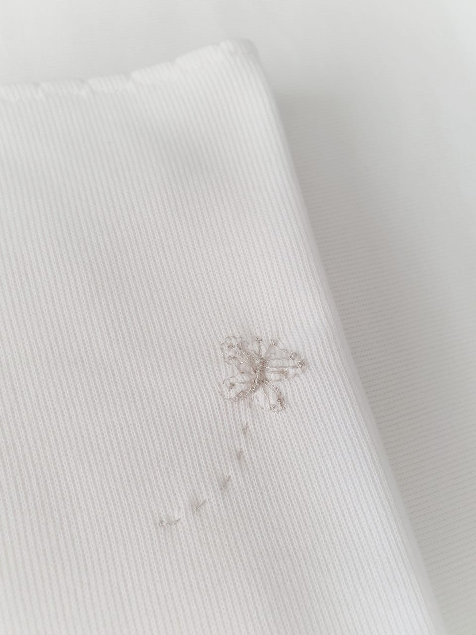 Bordados manuais em fio prata, acompanhando a coleção Papillons.