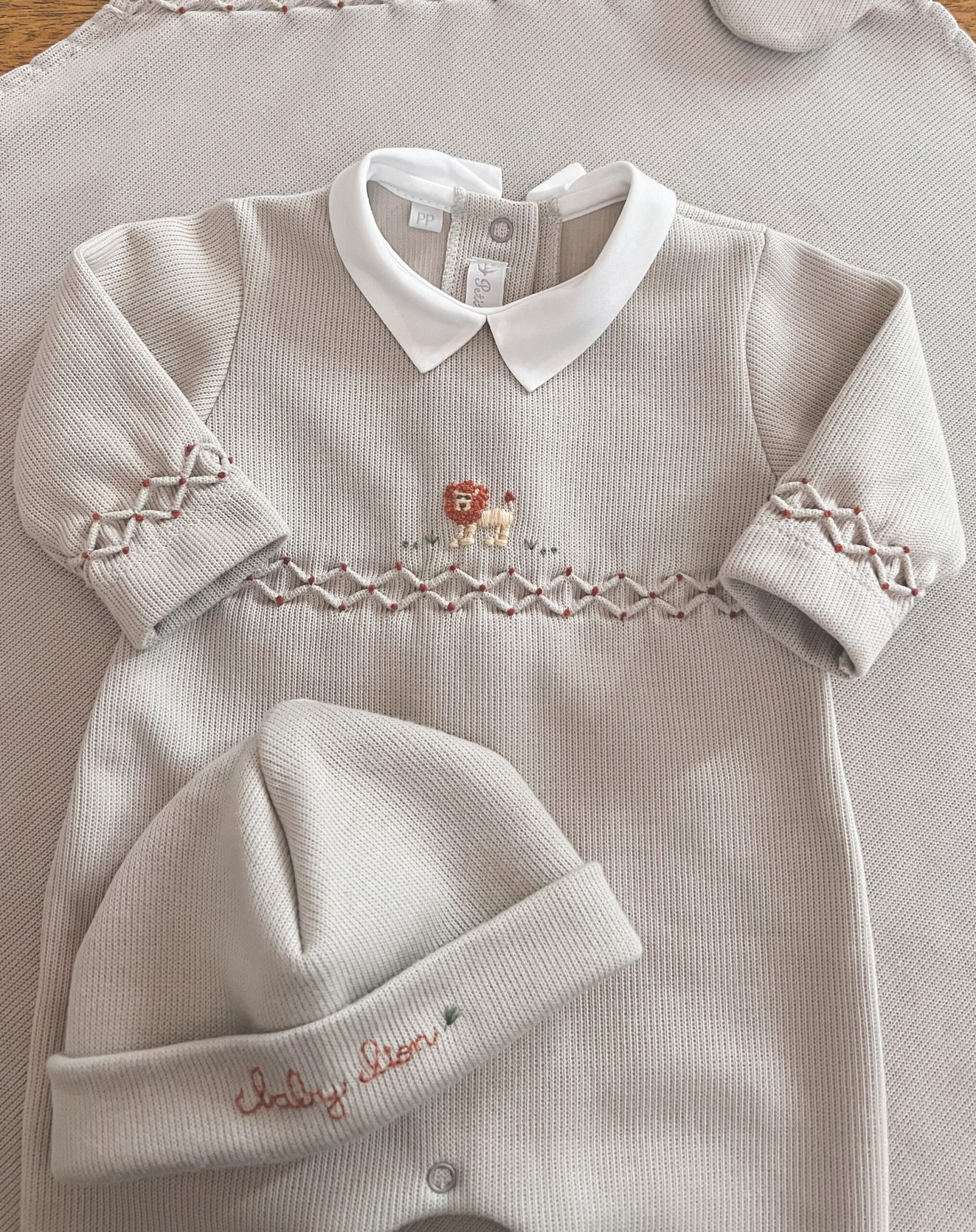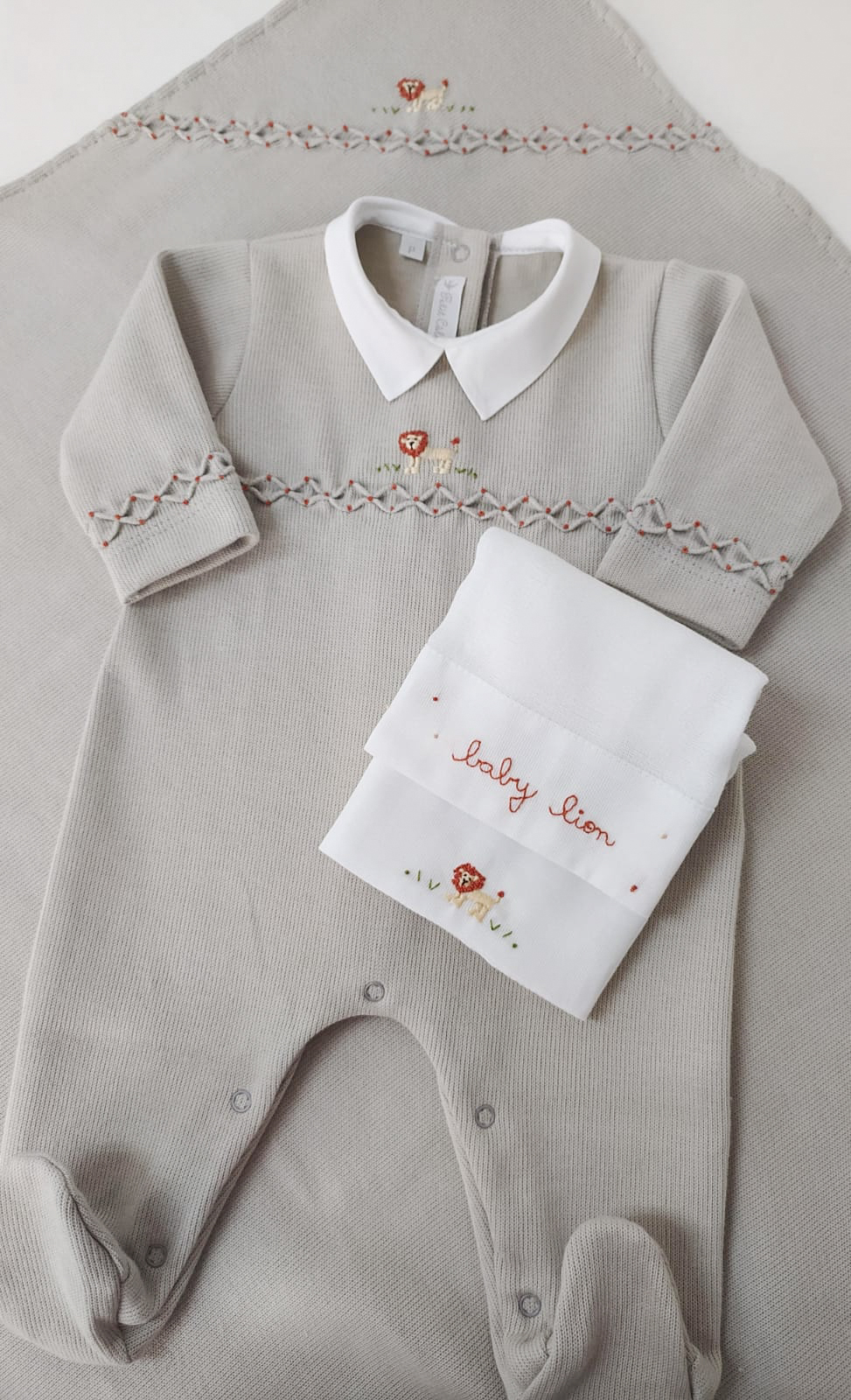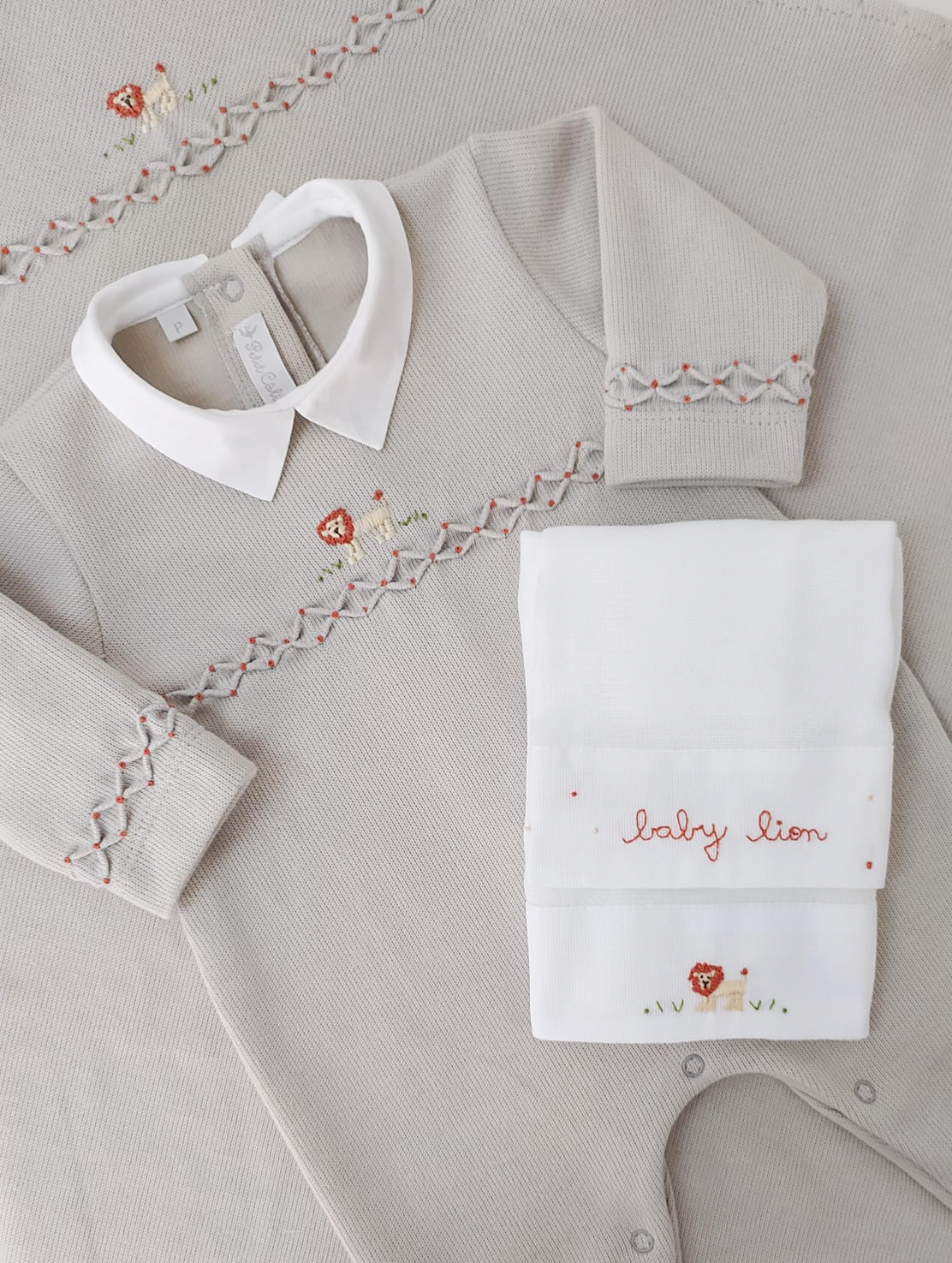 Bordados manuais de favos com poás e também temáticos, acompanhando a coleção Baby Lion.