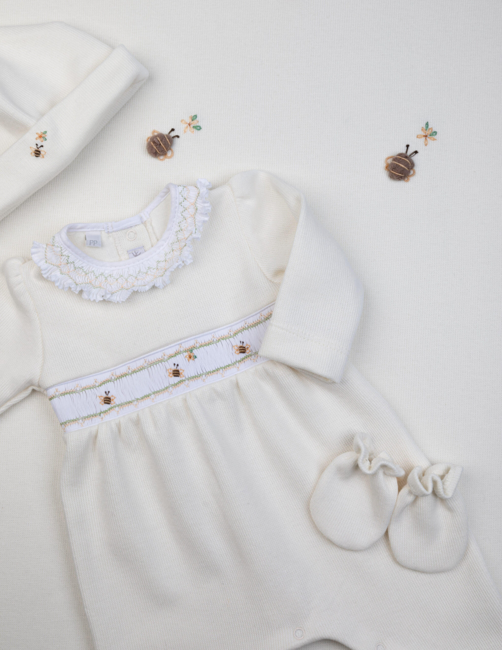 Com gola bordada em ponto smocking no tema da coleção Baby Bee.